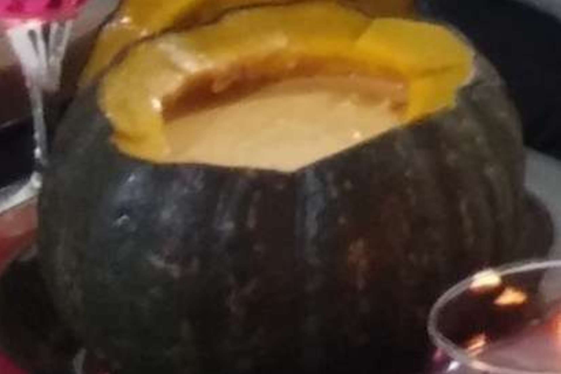Corte a parte superior da abóbora de modo que forme uma tampa. Tire todas as sementes, coloque um pouco de água dentro, tampe, embrulhe no papel alumínio e leve ao forno por aproximadamente 40 minutos ou até ficar macia (verifique espetando com um garfo).