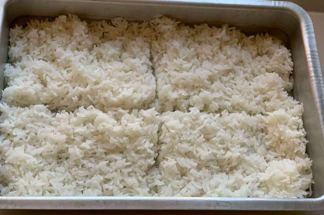Resfrie o arroz: Leve à geladeira para esfriar. Cubra com um pano úmido ou filme plástico até o momento de usar.