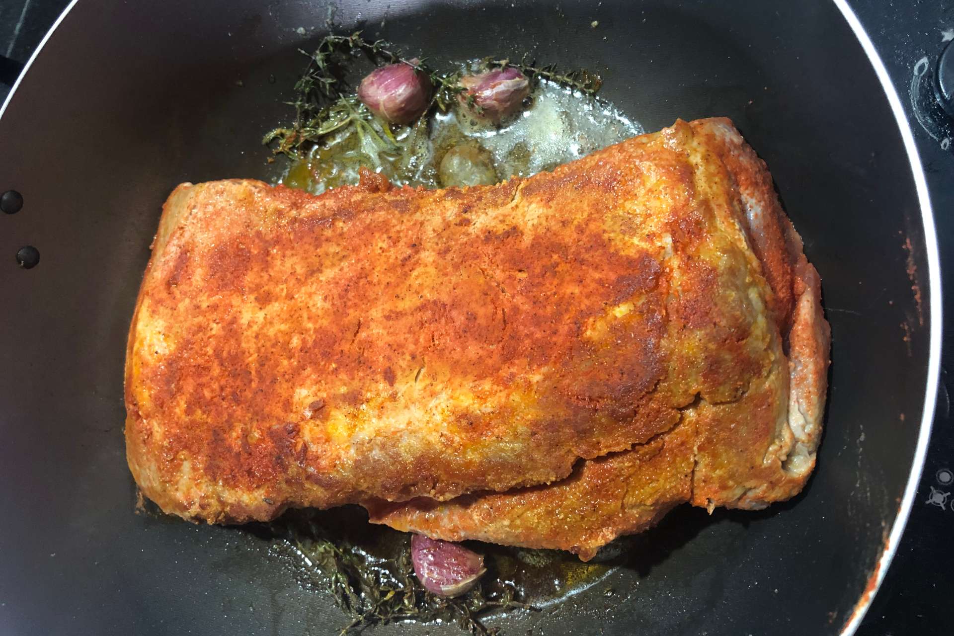 O lombo é todo envolvido por uma camada de páprica que dá sabor e cor. Depois ele é selado (dourado) de todos os lados, realçando ainda mais a cor e o sabor. E por fim, ele é cozido na panela com vinho branco, alho e tomilho. Super saboroso, macio, corado e fácil de fazer.