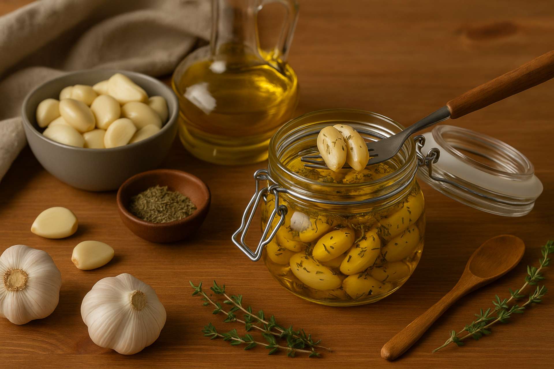 8. Conservação: Guarde o alho confitado submerso no azeite, em pote esterilizado, na geladeira, por até 60 dias. Use sempre utensílios limpos para evitar contaminação.