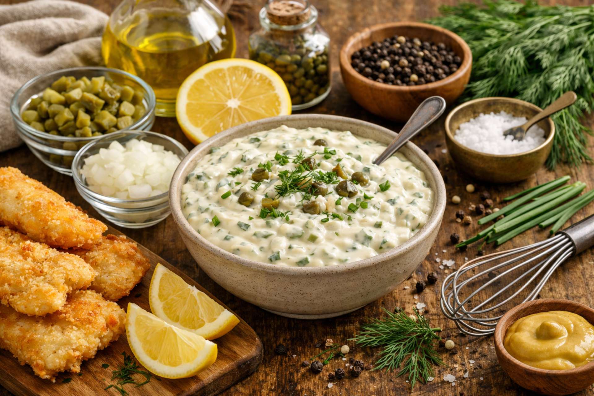 Sua base é a maionese, podendo ser preparada também com aioli, enriquecida com picles, alcaparras e ervas frescas, além de um elemento ácido, como suco de limão ou vinagre. O resultado é um molho frio, levemente ácido e aromático, ideal para acompanhar alimentos fritos, empanados ou grelhados, especialmente peixes e frutos do mar.