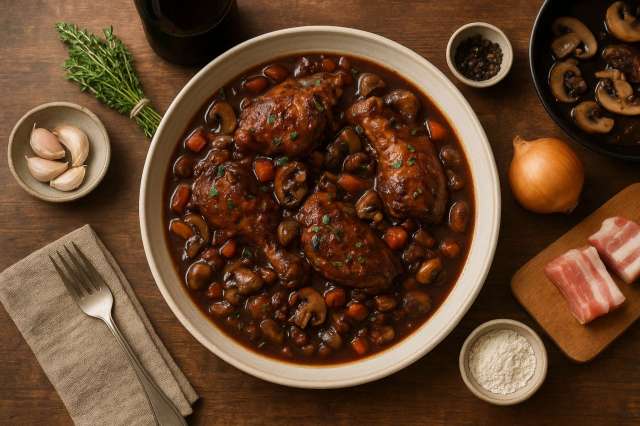 O Coq au Vin é um dos pratos mais emblemáticos da culinária francesa e suas raízes remontam às tradições rurais da França. Durante séculos, camponeses utilizavam galos mais velhos, de carne firme, que exigiam cozimento lento para ficarem macios. O vinho tinto produzido nas próprias regiões era o meio ideal para esse processo, conferindo sabor profundo e permitindo o aproveitamento total das aves disponíveis na fazenda.