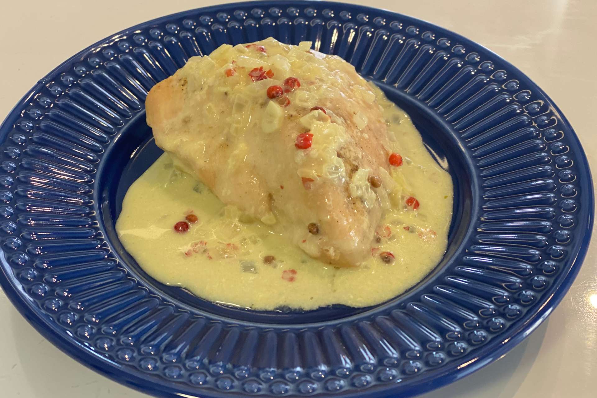 O Filé de Frango ao Molho de Pimenta Rosa é um prato delicioso e muito fácil de preparar. O filé é assado embalado em papel alumínio e depois dourado no forno. O molho é preparado com vinho branco, leite de coco, mostarda e pimenta rosa. O Filé de Frango é servido acompanhado pelo molho de pimenta rosa e purê. Indico o purê de mandioquinha preparado sem lactose. Experimente!