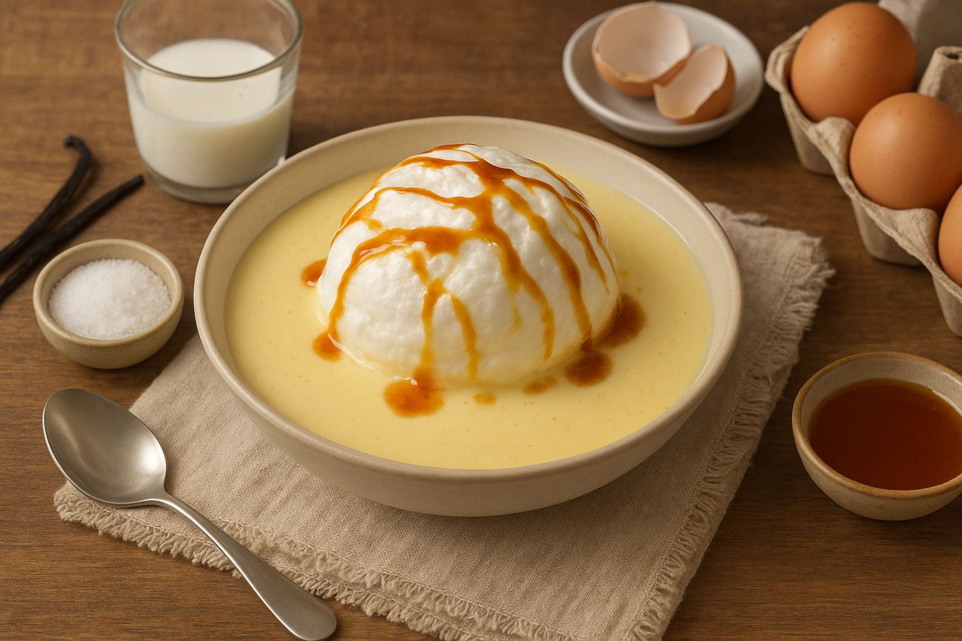 Os Ovos Nevados, conhecidos em francês como Île Flottante, são uma sobremesa clássica da confeitaria francesa que remonta ao século XVIII. Seu nome faz referência direta ao visual do prato: porções leves de merengue cozido, que flutuam sobre um delicado creme inglês, lembrando pequenas “ilhas” repousando sobre um mar de baunilha.