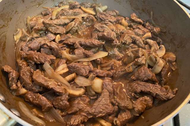 Tempere a carne com sal e pimenta do reino. Em uma frigideira, aqueça o azeite e despeje a carne, sele bem. Acrescente os cogumelos e a cebola, refogue até a cebola caramelizar. Adicione o molho barbecue e deixe refogar por mais 2 minutos. Finalize com a salsinha. Sirva com arroz branco e batata palha.