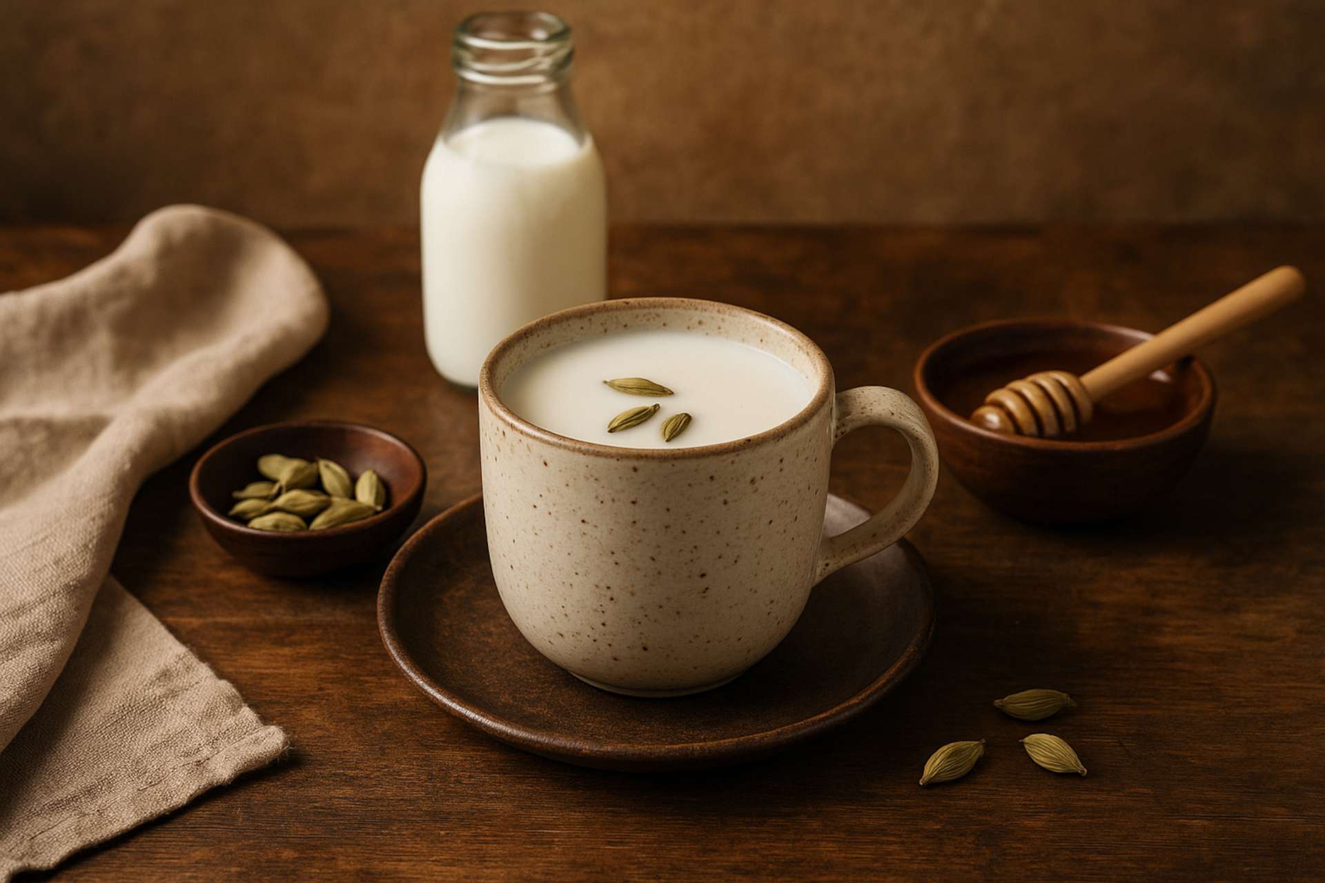 - Na tradição védica, o leite morno com especiarias como cardamomo, cúrcuma ou noz-moscada é considerado um alimento sáttvico[1], ou seja, que promove clareza mental, tranquilidade e equilíbrio.