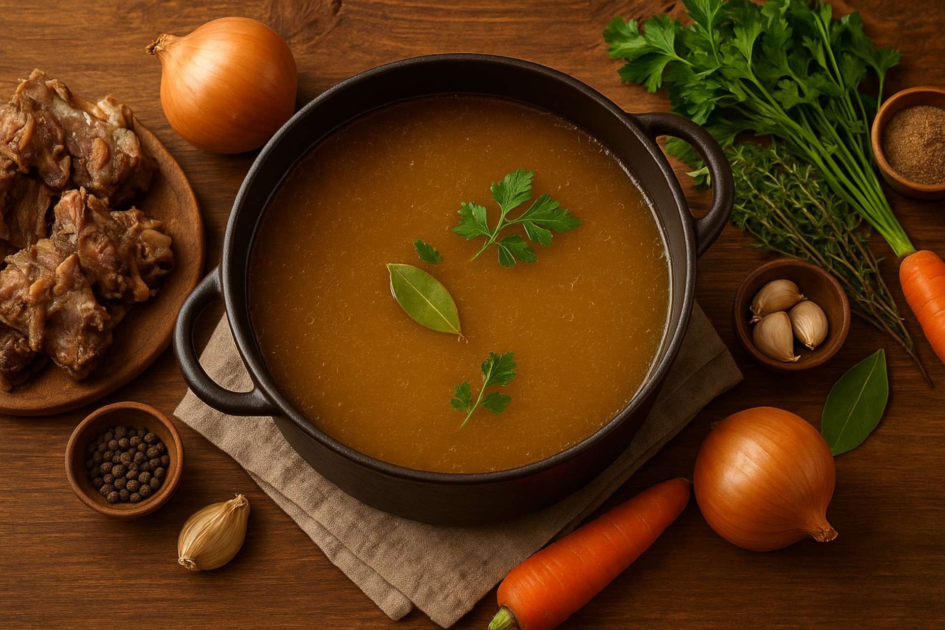 Adicione a água, levando a panela ao fogo alto até ferver. Reduza o fogo e cozinhe em fogo baixo por 2 a 3 horas, retirando a espuma que se formar na superfície. Após o cozimento, coe o caldo usando uma peneira fina. Descarte os sólidos. O caldo pode ser usado imediatamente ou conservado na geladeira por até 3 dias.