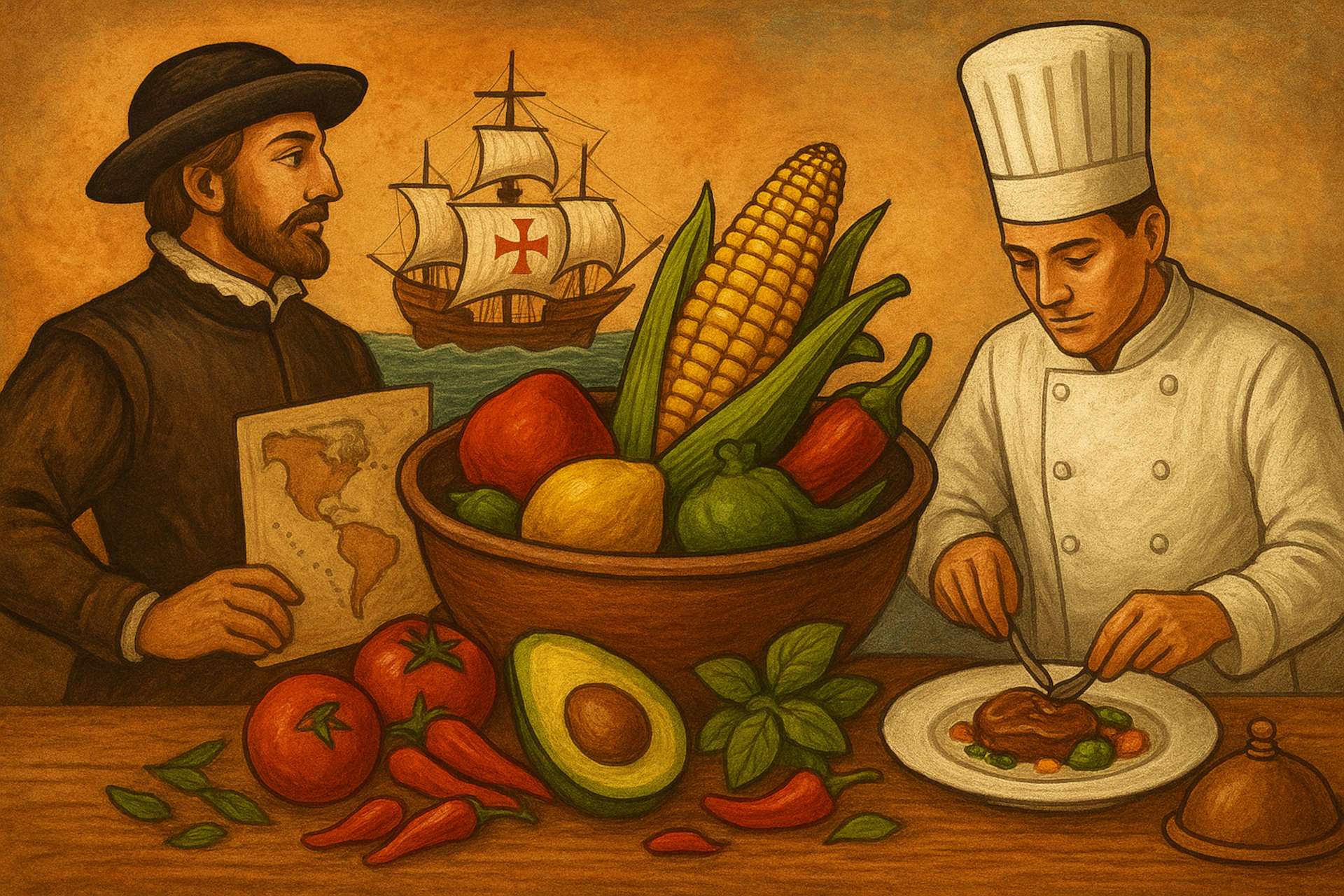 A expansão marítima dos séculos XV e XVI não transformou apenas mapas, mas também cozinhas. O encontro entre continentes levou novos sabores à mesa europeia, como o tomate, a batata, o milho e o cacau, e deu início a uma revolução gastronômica silenciosa, mas profunda. Com o tempo, essas trocas moldaram a identidade culinária de povos inteiros e pavimentaram o caminho que levaria a comida do campo e dos portos às refinadas mesas da alta gastronomia.