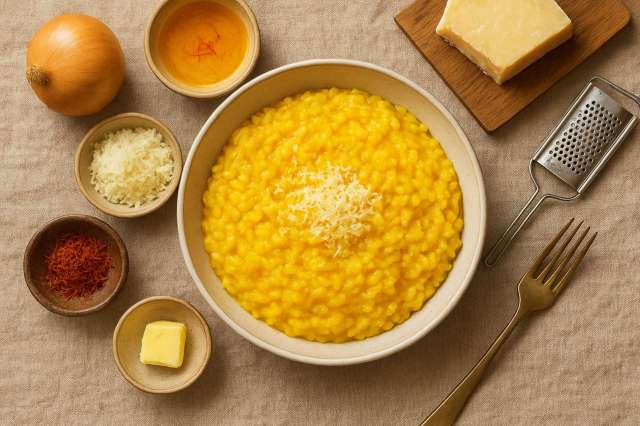 Os primeiros risotos eram preparações muito simples. Não incluíam cebola, vinho branco, queijo, ervas aromáticas ou manteiga em algumas versões iniciais. O uso do açafrão também não era parte de todas as receitas, mas ganhou espaço ao longo dos séculos, especialmente em Milão. Nesta receita, apresentamos uma versão histórica evoluída, típica dos séculos XVII e XVIII, já incorporando ingredientes como manteiga, cebola e Parmigiano-Reggiano, porém sem vinho branco e sem carnes. Trata-se de uma adaptação moderna que respeita o espírito da Idade Moderna, mantendo as características essenciais do preparo tradicional.