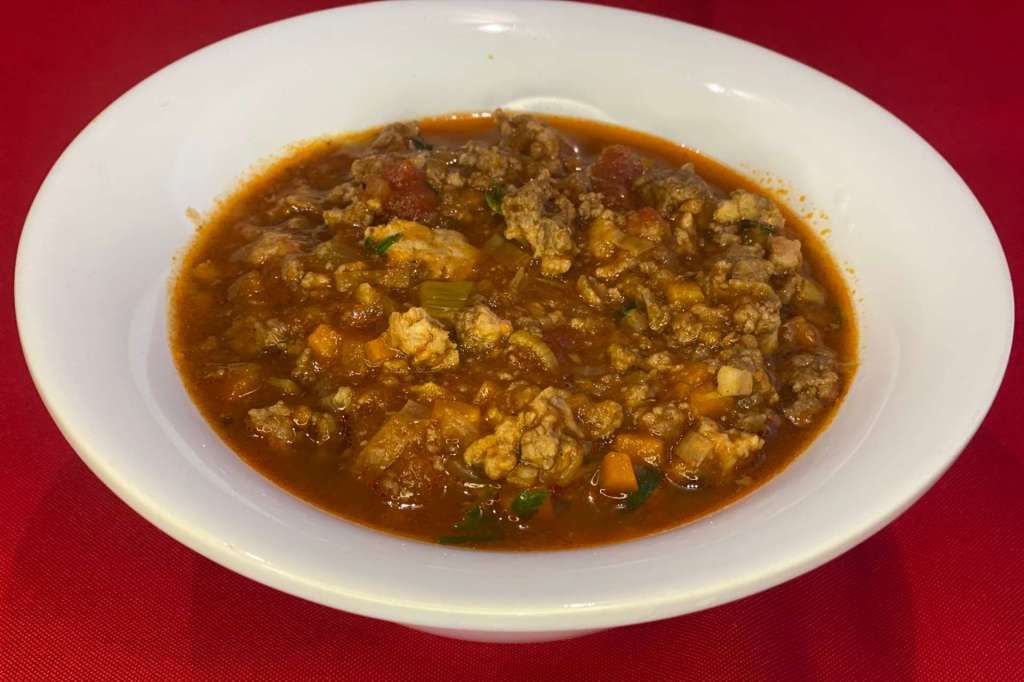 Coloque o azeite, a manteiga e a cebola na panela e ligue em fogo médio. Refogue a cebola até ficar transparente e acrescente o salsão e a cenoura. Cozinhe por cerca de cinco minutos, mexendo bem os legumes. Acrescente as carnes moídas e uma pitada de sal e pimenta-do-reino. Esmigalhe as carnes com um garfo e cozinhe até que elas percam o avermelhado de carne crua. Acrescente a água e uma pitada de noz-moscada e cozinhe em fogo brando, até secar. Aumente o fogo, acrescente o vinho e deixe secar.