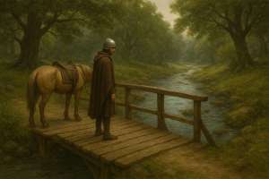 Balder apeia, amarra seu cavalo no peitoral da velha ponte de madeira e fica ali, olhando para o nada. Está se sentindo perdido. Após alguns minutos estático, ouve o burburinho da água cristalina do pequeno riacho. Seu olhar acompanha o movimento dele.