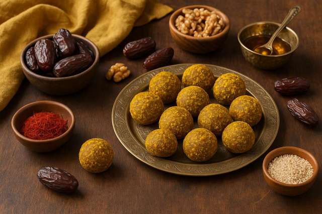 Tâmaras e mel eram considerados ingredientes sagrados em muitas culturas antigas, associados à longevidade e à fartura. A combinação com especiarias como o açafrão confere um toque sofisticado e remete aos banquetes dos antigos impérios orientais.