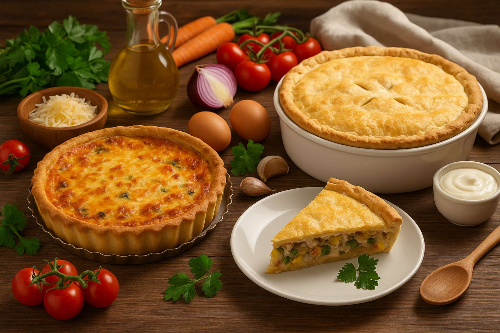 O empadão e a torta salgada compartilham o mesmo princípio: recheios envoltos por uma crosta de massa. A principal diferença entre os dois está na textura da massa. O empadão costuma ter uma crosta mais espessa, firme e amanteigada, ideal para sustentar recheios mais úmidos e robustos, como frango cremoso, carne moída ou camarão. Já a torta salgada tem uma base mais fina e delicada, podendo ou não ser coberta, e se adapta bem a recheios variados, com queijos, vegetais, embutidos ou cogumelos.
